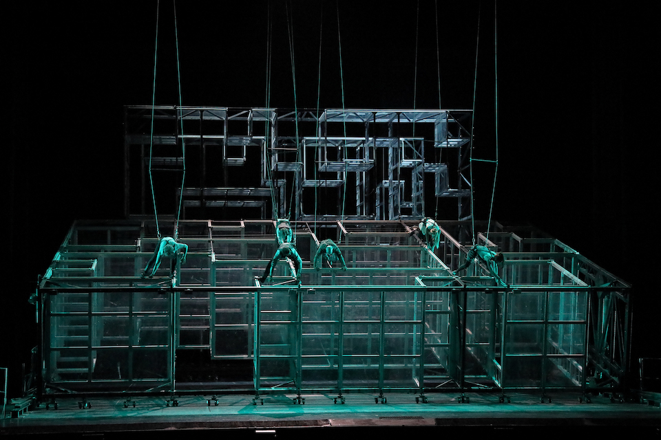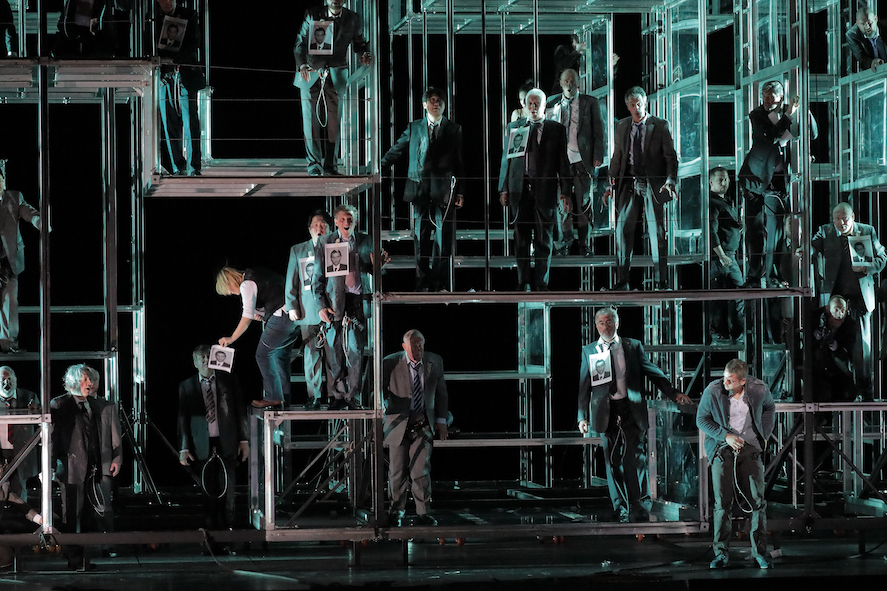 It seemed to me that this production by the Spanish stage director the operatic enfant-terrible Calixto Bieito would not appeal to everyone. The Perspex illuminated boxes symbolise the claustrophobic environment of prison cells. Zigzag lighting connoting mental distortion in the prisoner’s psyche dominated the opening. As we watched Leonore dressing as a man we were fed a monologue from her which is not in the original libretto. When the overture started it was Leonore no. 3 (1806) rather than the final Fidelio overture (1814). Another strange addition was the incorporation of the ‘Molto adagio’ from Beethoven’s string quartet in A minor op.132 between the two scenes of Act II, the position traditionally held (until about 1960) by the Leonore overture no.3. Although it was beautifully played by the Odeon-Quartett suspended from the ceiling in cages adding calmness and love to the reunited husband and wife on stage.