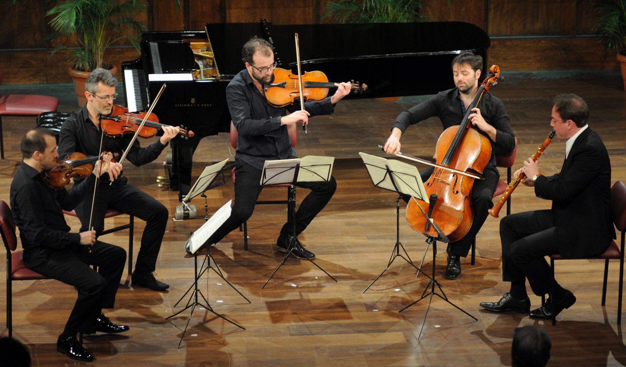 The final piece of the second evening was the crowning glory of the clarinet’s chamber repertoire. Written in 1789 this late work by Mozart was written for the Virtuoso clarinettist Anton Stadler for whom Mozart also wrote his valedictory clarinet concerto. This work in four movements could not have received a more impeccable performance. The playing embodied Viennese “gemuetlichkeit” with the light and shade of true Mozartian style. The clarinettist again was Olivier Patey playing a basset clarinet made specially for him in Bamberg, Germany. This instrument has a more liquid sound than the more reedy modern counterpart. The basset clarinet was used in Mozart’s day but modern clarinettist prefer to use a B flat or A clarinet. The basset clarinet is made of box wood rather than ebony, is longer and has an upturned snout and an extension in the lower range. Patey sitting in the centre blended his liquid tone with the strings impeccably creating the illusion of a breathless string sound. Never have I heard such fine music making in the context of musical blending of apparently disparate sound. Bravo and here’s to the next season!