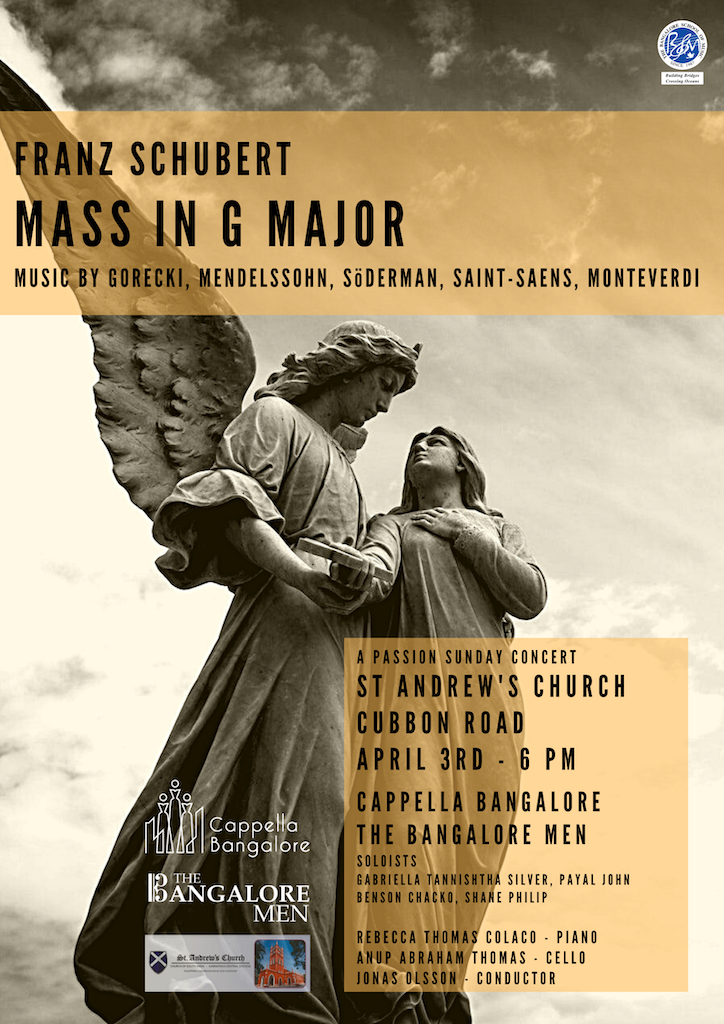 Nevertheless, the last months of 2021, we in Cappella Bangalore and The Bangalore Men, were fortunate enough to be able to do not more than five concerts – among those two performances of Bangalore Rhapsody and our traditional Christmas concert, Carols in the City, at Bangalore International Centre. The concerts were done in an almost feverish rush, we squeezed them all in the period of October to December – anxiously anticipating what would come, would guidelines change, would we be able to continue to rehearse, would we be able to carry on singing together? Therefore, it was of course rather of a setback when the situation quickly took a turn for the worse, and we were forced to, in January of 2022, once again return to virtual rehearsals, luckily only for a shorter period though. Since mid-February, our choirs are now meeting yet again for physical rehearsals – where we are preparing for our upcoming concert – A Passion Sunday Concert, including the short and sweet Mass in G-Major by Franz Schubert.