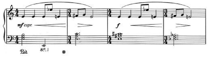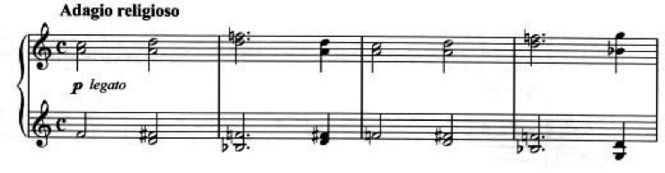 Like so many other pieces in Images from Childhood, Prayer does not fit into a conventional tonality. However, the four-part choral writing, complete with a calm rhythmic pulse and predictable phrase structures, helps to mask any moments of unease or uncertainty that might develop due to a missing tonal center. Throughout the piece, several unexpected harmonic moments arise and rather than detracting from this musical prayer, they add to the reverence and awe of each newly discovered chord and sequence of chords. It is because of Prayer’s simple texture that these magicalaural moments are so effective. Purposefully placed as the last piece in Images from Childhood, Prayer serves as a peaceful, contemplative coda to this retrospective of youth.