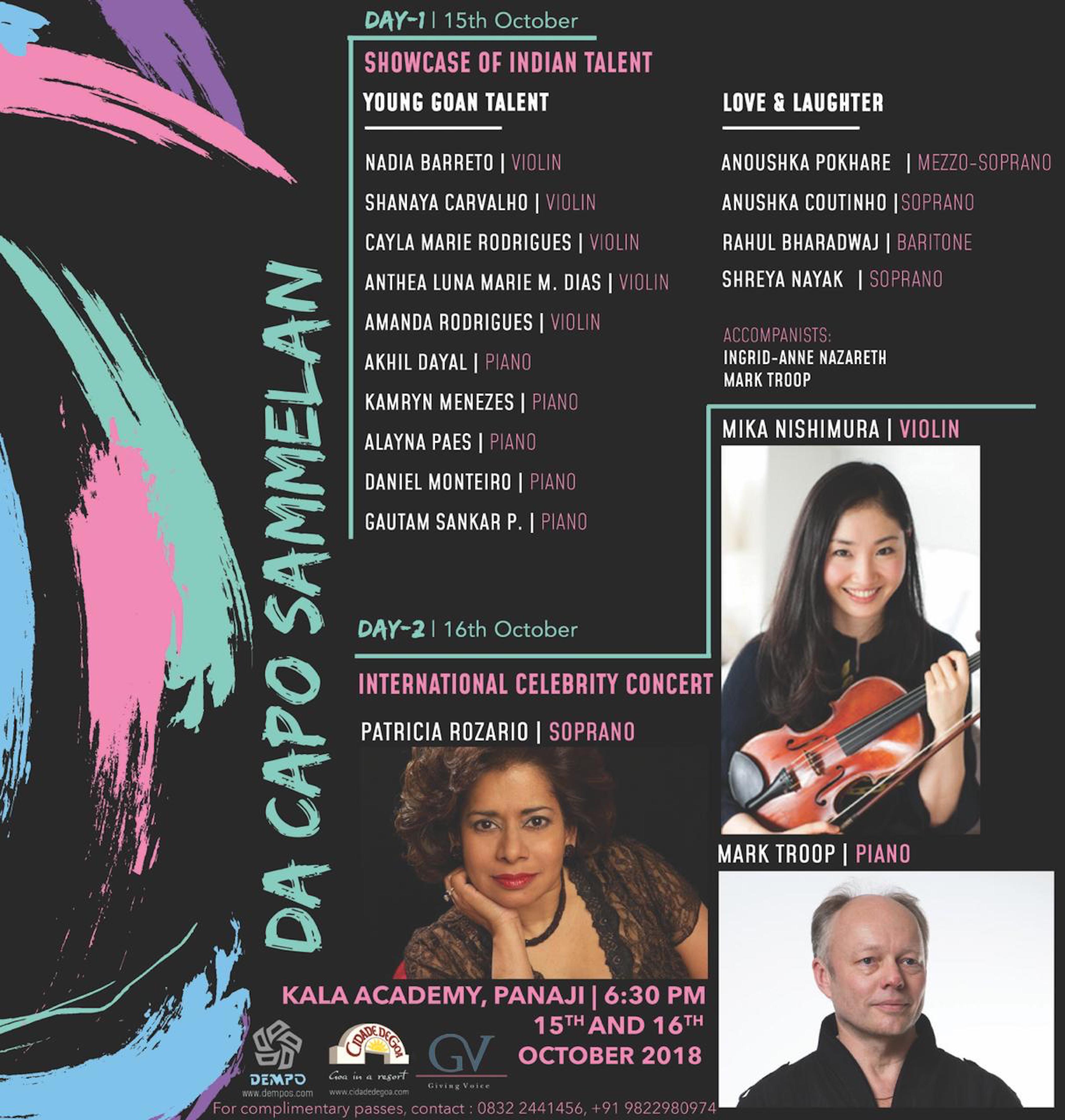 For the 2018 edition of Da Capo Sammelan, the international concert features Patricia, her pianist husband Mark Troop and Mumbai-based Japanese violinist Mika Nishimura in an entertaining concert of Western classics for voice, violin and piano, and an Indian song cycle by Vanraj Bhatia. The Indian concert showcases talented Goan students performing on piano and violin, and singers from Giving Voice Society providing ‘Love and Laughter’ – a selection of romantic arias, and humorous songs by Flanders and Swann.