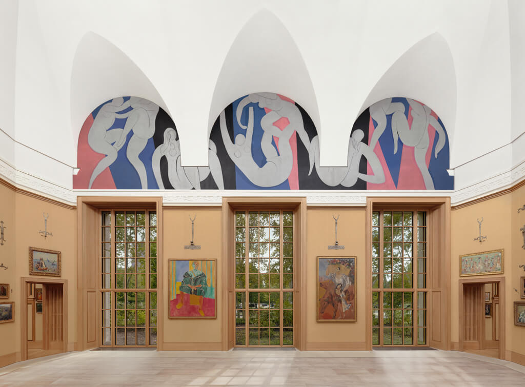 In 1909, the Russian collector Sergey Shchukin, commissioned Matisse’s paintings ‘La Musique’ and ‘La Danse’. The circle of dancers became the inspiration for the monumental fresco commissioned by Dr. Barnes for his mansion in Merion, Pennsylvania. Matisse was inspired by the three rounded arches (lunettes) which reflected the dynamism of his dancing figures. While working on the fresco, Matisse made use of cut-out coloured paper to test the various effects of form and movement – a method he would later perfect after he could no longer paint.