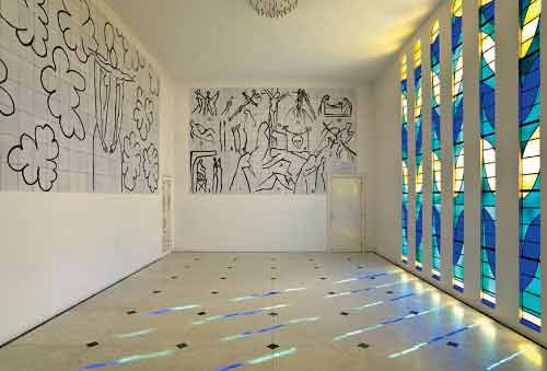 During the last years of his life, Matisse designed the Chapelle du Rosaire for the Dominican Sisters of Vence, and considered it his masterpiece. The serenely white exterior and interior is enhanced by the beautiful stained-glass windows (again using cut-outs) in blue, green and yellow, replicating the tree of life, expressing, in a limited space, the idea of immensity and serenity. The windows’ reflection throughout the white interior of the chapel emphasises the music of colour – so important for Matisse during his entire life.