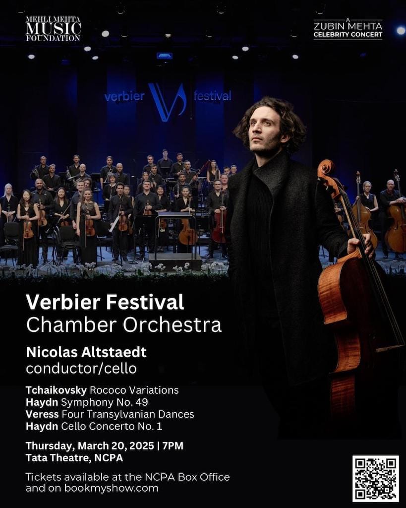 The Verbier Festival Chamber Orchestra will perform at the Tata Theatre, NCPA Mumbai, on March 20, 2025, presented by the Mehli Mehta Music Foundation. Conducted by and featuring cellist Nicolas Altstaedt, the programme includes Tchaikovsky’s Variations on a Rococo Theme (original version for strings), Haydn’s Symphony No. 49 “La Passione” and Cello Concerto No. 1 in C major, and Veress’ Four Transylvanian Dances.
