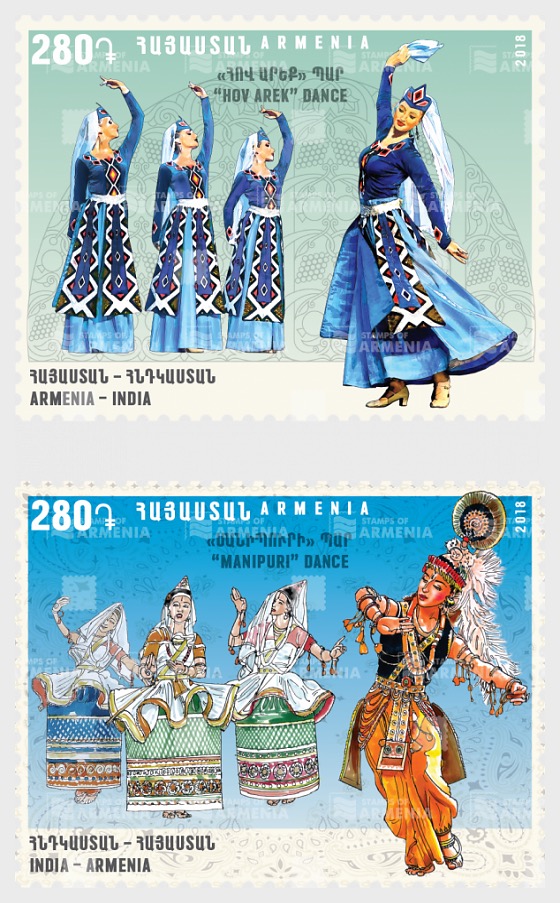In the context of Armenia-India relations, Manipuri classical dance received significant recognition reflected in a 2018 postage stamp issued by Armenia. This commemorative stamp portrayed the Manipuri dance form alongside Armenia’s Hov Arek, acknowledging both as representative of their respective national dances. The joint issue of postage stamps by Armenia and India highlighted the cultural significance and artistic depth of these traditional dance forms.
