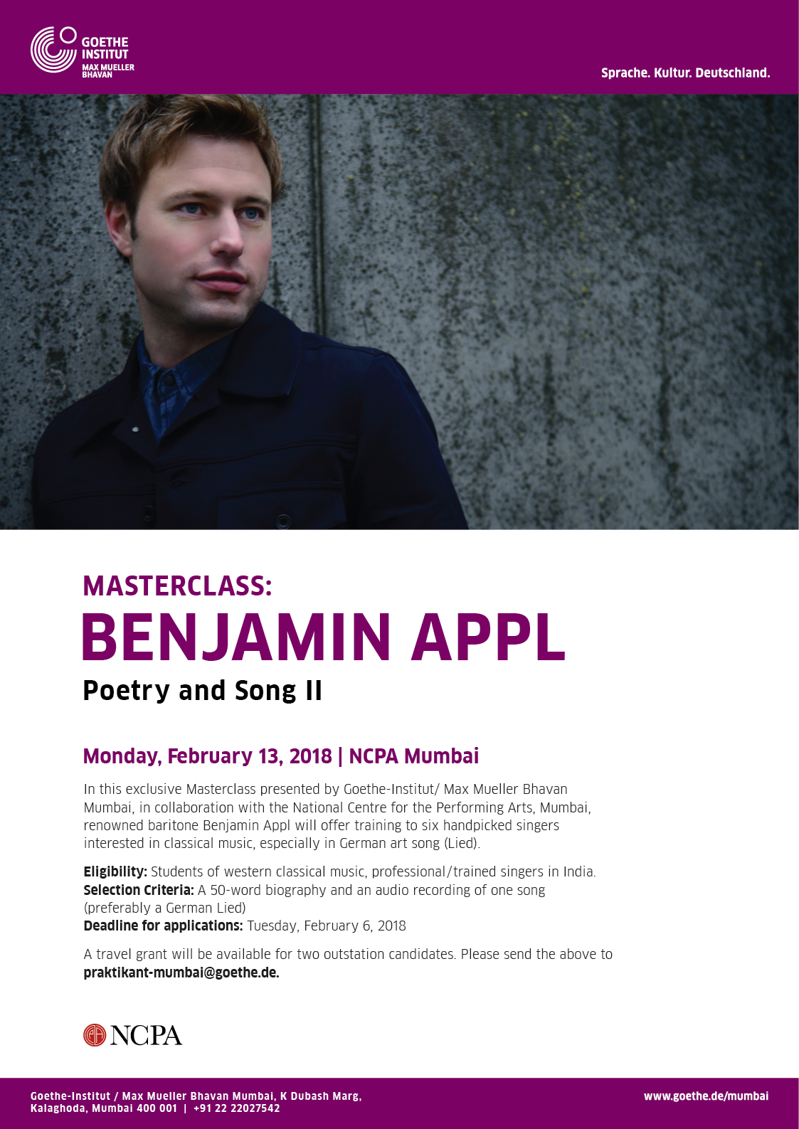 renowned baritone Benjamin Appl will offer training to six handpicked singers interested in