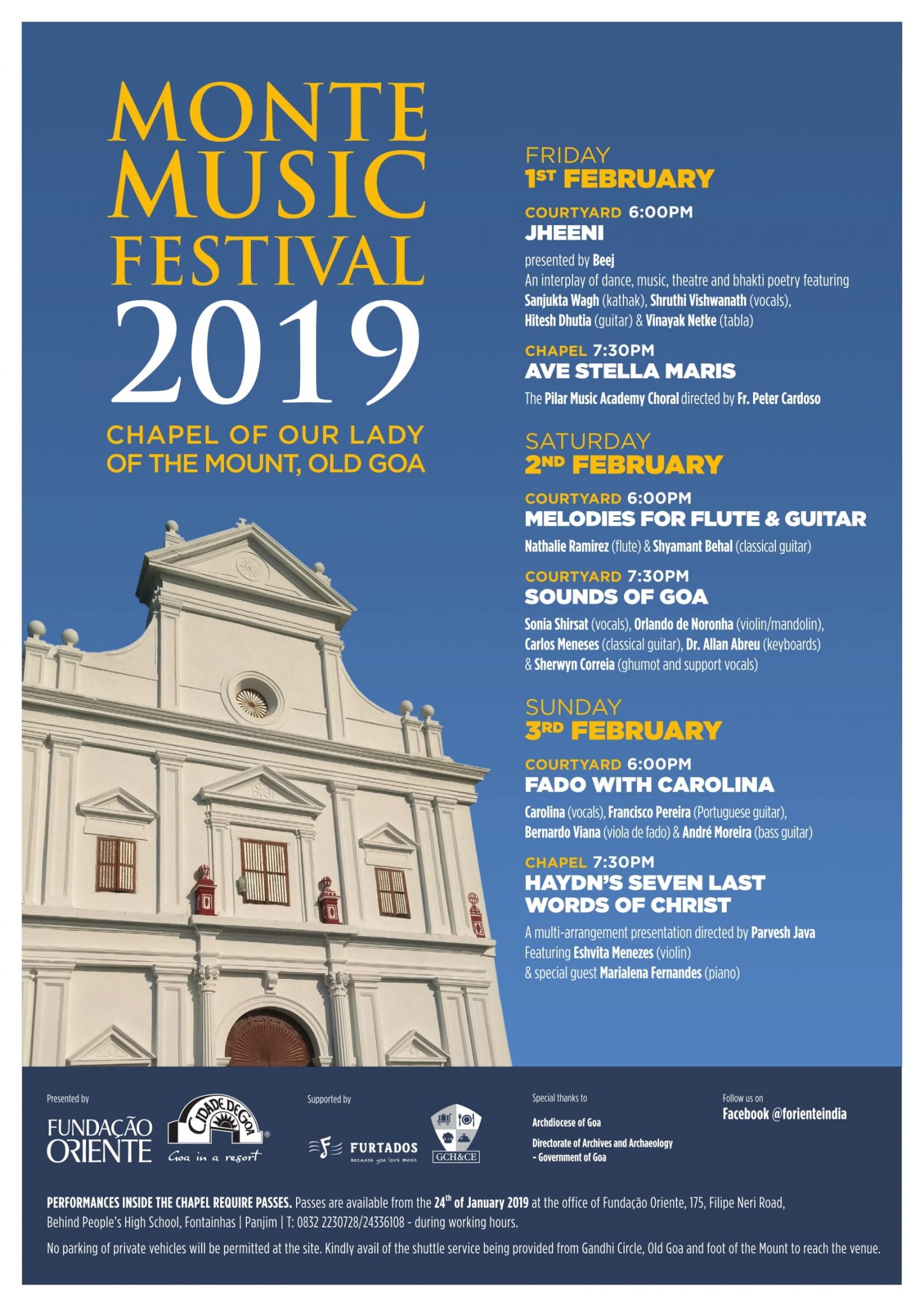The 17th edition of Monte Music Festival, presented by Fundação Oriente and Cidade de Goa, will be held from the 1st to the 3rd of February 2019 at the Chapel of Our Lady of Mount, Old Goa. With its first edition in 2002, after the restoration of the Chapel by Fundação Oriente, the festival has continuously gathered attention and interest from Western and Eastern music and dance enthusiasts. Held at one of the most spectacular locations in Goa, the Monte Music Festival is a unique event, which has carved a niche of its own among all cultural events held in the state. With performances held inside the old heritage chapel and its courtyard with a backdrop of the picturesque Chorão, Divar islands and the river Mandovi, the festival begins at sunset and goes on till about 9pm.