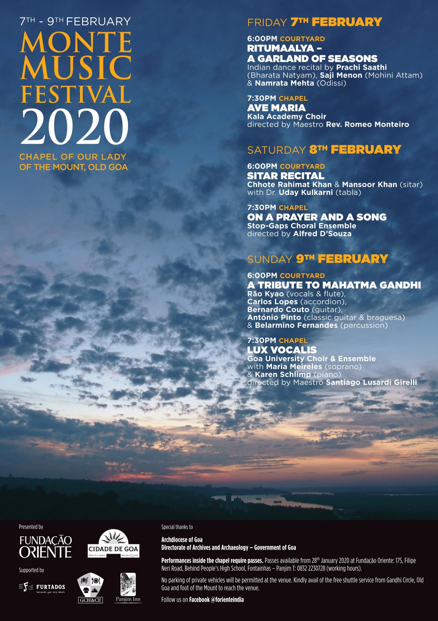 The 18th edition of the Monte Music Festival, presented by Fundação Oriente and Cidade de Goa, will be held from 7th to 9th February 2020 at the Chapel of Our Lady of Mount, Old Goa. Ever since its first edition in 2002, after the restoration of the Chapel by Fundação Oriente, the festival has continued gathering great attention and interest from both Western and Indian music and dance enthusiasts. Held at one of the most spectacular locations in Goa, the Monte Music Festival is a unique event, which has carved a niche of its own among all cultural events held in the State. With performances held inside the old heritage chapel and in its courtyard with a backdrop of the picturesque Chorão and Divar islands, and the river Mandovi, the Festival begins at sunset and goes on till about 9pm.
