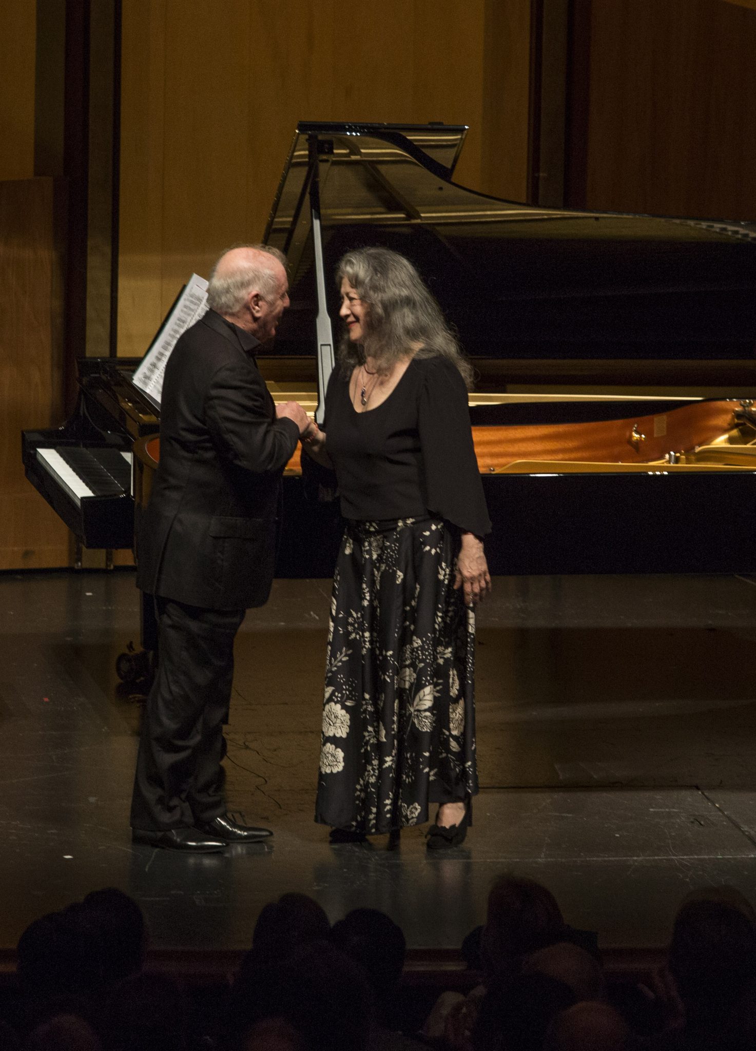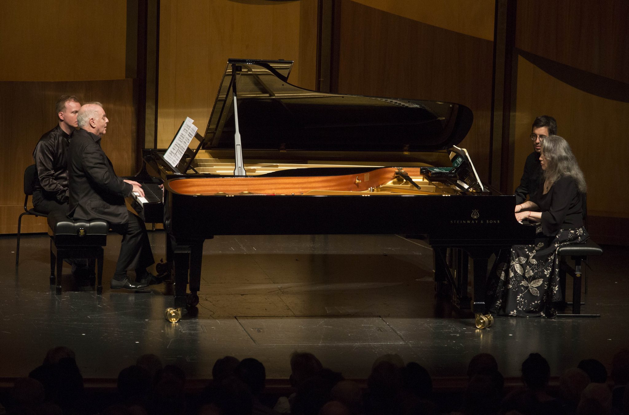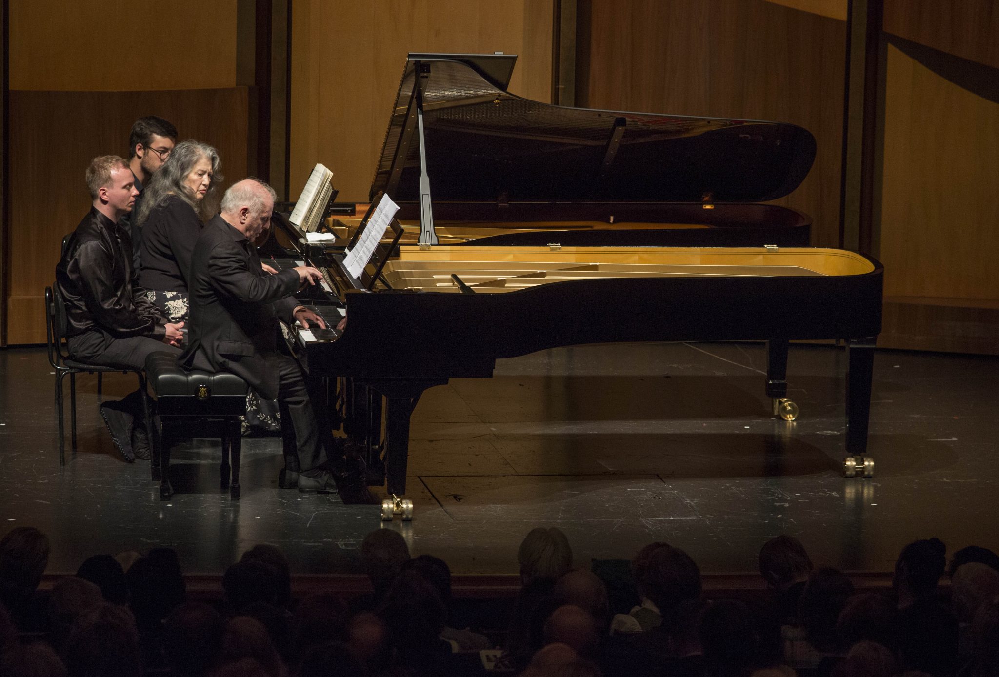 Mozart wrote Sonata in D major K 448 for his piano pupil Josepha Auernhammer saying of her “the young lady is a fright but plays enchantingly”. This concerto-like sonata gives equal opportunities to both pianists in virtuosic and melodic passages. The first movement starts with an arresting fanfare in D major and almost immediately takes over into rivulets and cascades of scales and arpeggios in semi-quavers thrown back and forth between the two pianists. The second half begins with a most sedate fugal theme returning to the opening material after much modulation. Here Barenboim took first piano and displayed immaculate technique and nuance. He had a beautiful singing line in the slow movement’s main theme. Equally delicate and beautiful was Martha Argerich’s every retort. Martha Argerich on second piano played the new theme at the beginning of the middle section with great gentility and sparse movement. The two pianists ended together with the gently moving undulations of the slow movement. The last movement’s sprightly main theme is introduced by the first piano. There are melodic interludes and continuing semi quaver figurations right through the movement which keep it lively and full of brilliance. The two pianists matched each other note for note measure for measure phrase for phrase in this uniquely beautiful work written and premiered in Vienna in 1781. After this work came two more works for piano four hands (in F major and C major) but none other for two pianos.