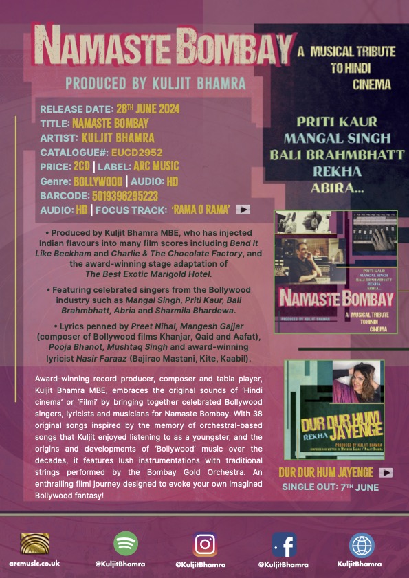 Namaste Bombay – a first-of-its-kind album – from award-winning composer, producer, and performer Kuljit Bhamra sees its highly-anticipated release on June 28th, 2024. An album born from beloved childhood memories, artistic integrity, and a passion for restoring and sharing the magic of authentic music, Namaste Bombay is infused with UK-based talent and celebrates the music that would form the basis of the worldwide phenomenon that is Bollywood.