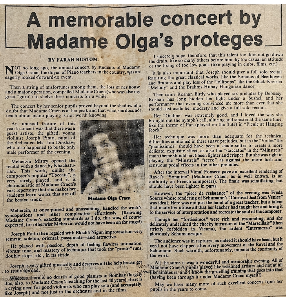 As we celebrate the 10th anniversary of the YMOY Award, it is clear that Olga Craen’s legacy continues to resonate in the lives of her students and the broader Western classical music community in India. The memories and anecdotes shared by her former students offer a glimpse into the life of a woman who was not only a remarkable teacher but also a deeply human figure, full of warmth, humour, and an unyielding dedication to her craft.