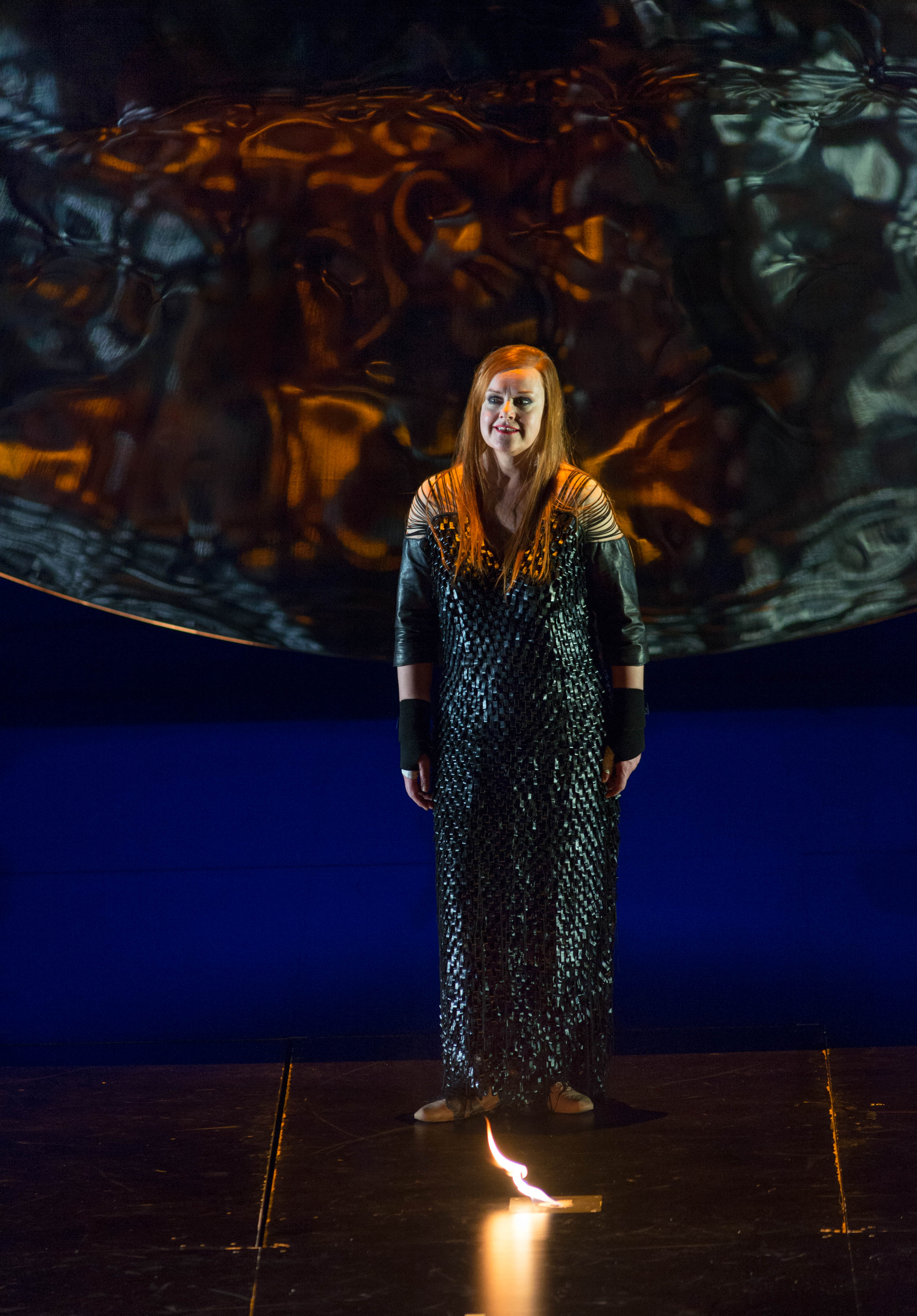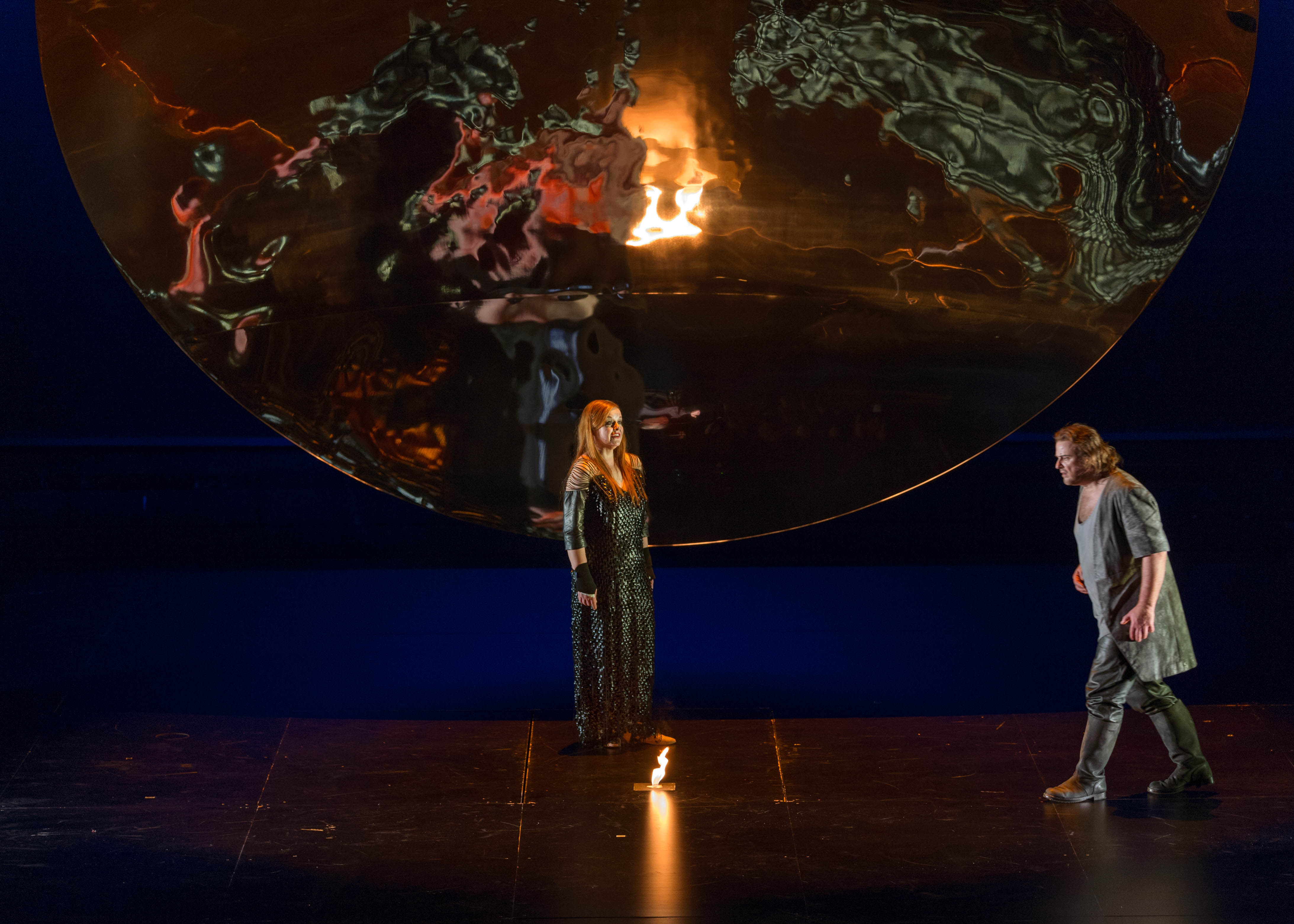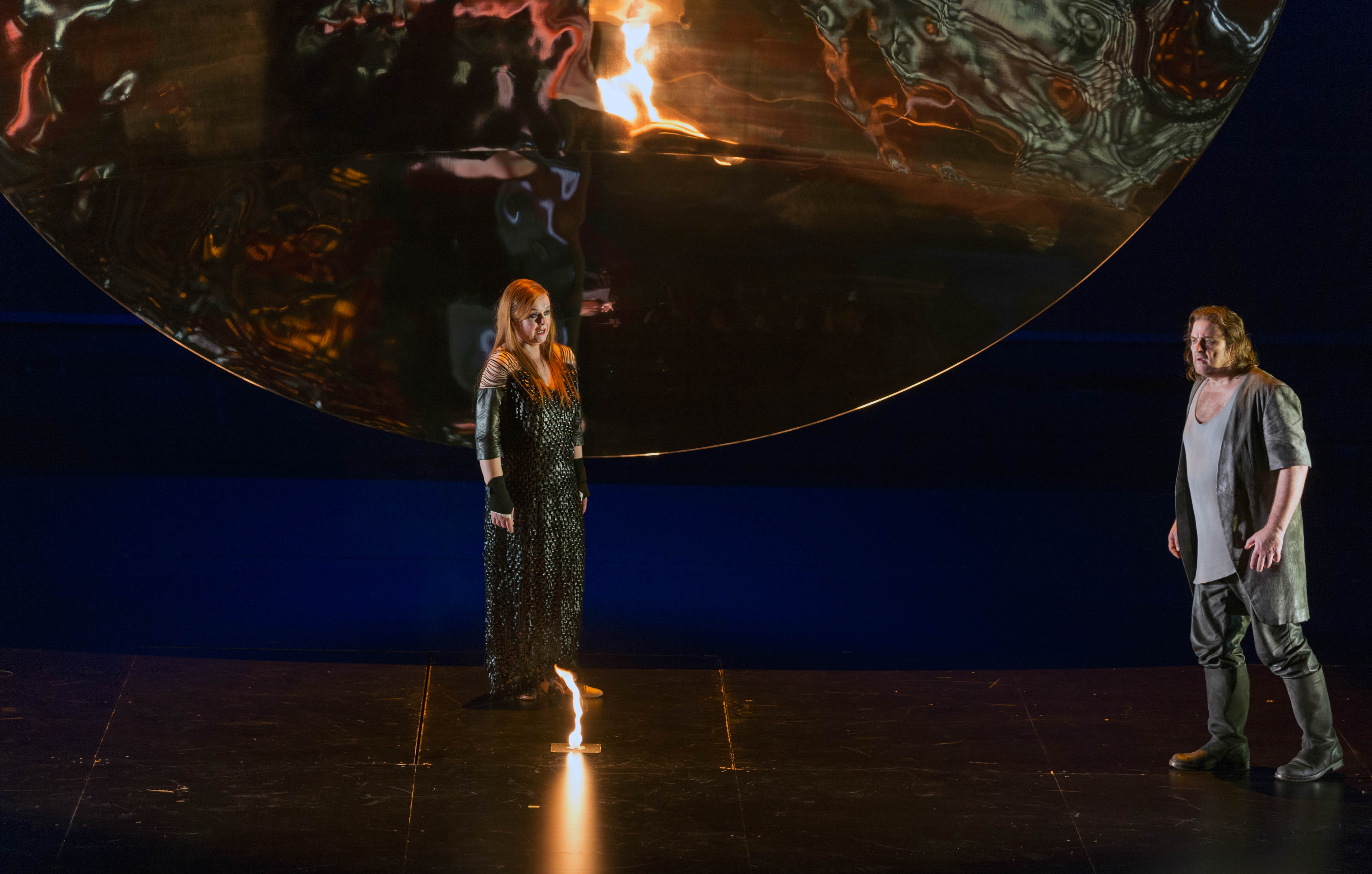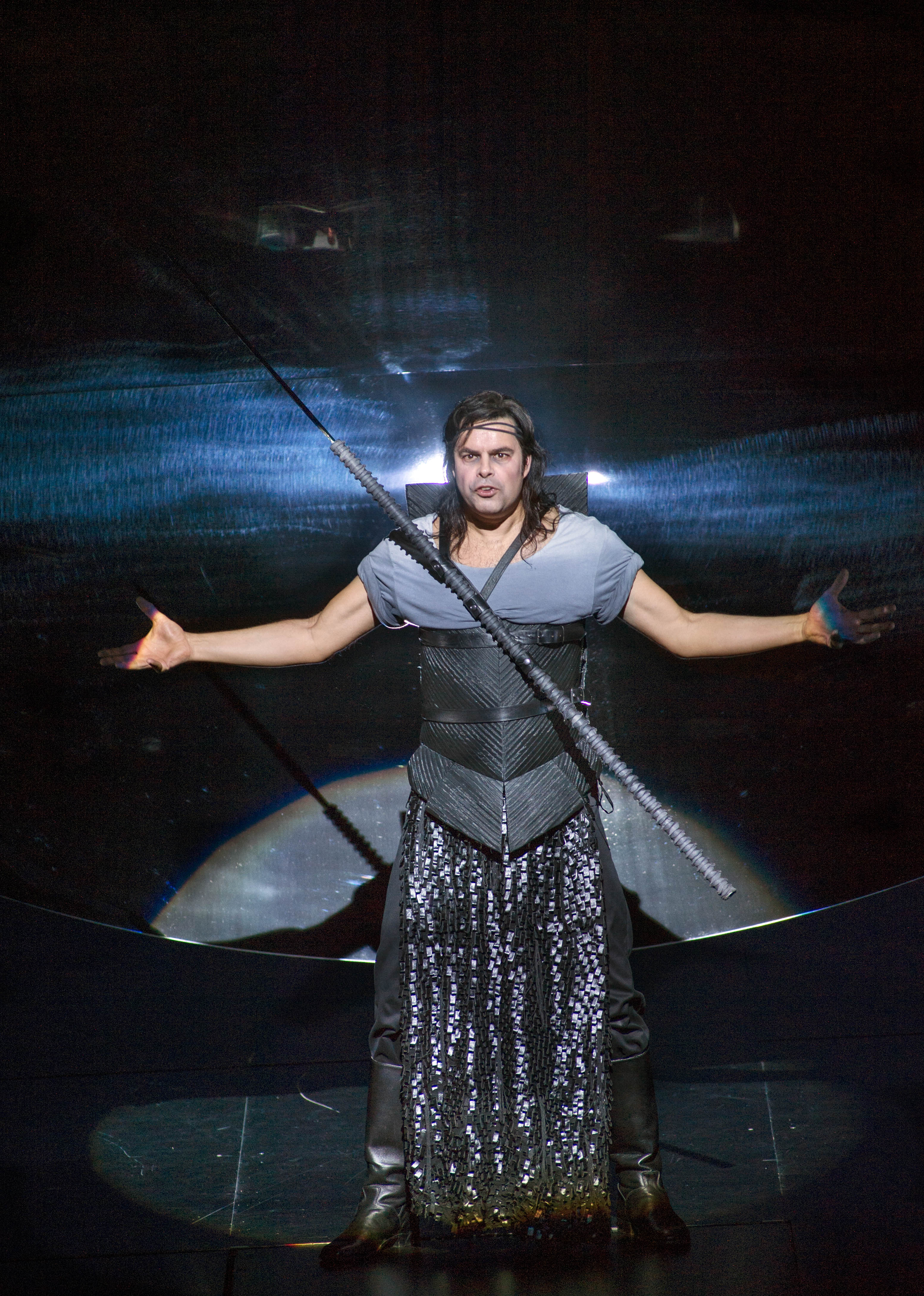 The set design by Anish Kapoor partly incorporated a gigantic concave mirror suspended by near invisible steel wires above the stage. This allowed director Pierre Audi to access the floor of the space clear of set artifacts, so that action could move freely. The presence of the huge mirror in some of the scenes was as much a reflective surface as also one that made available a meditative reflection on the deeper themes in the drama, graphically intensifying the figures of the actors moving before it in striking ways, both distorting and beautifying the amplified visual forms in a chaos of colour and form.