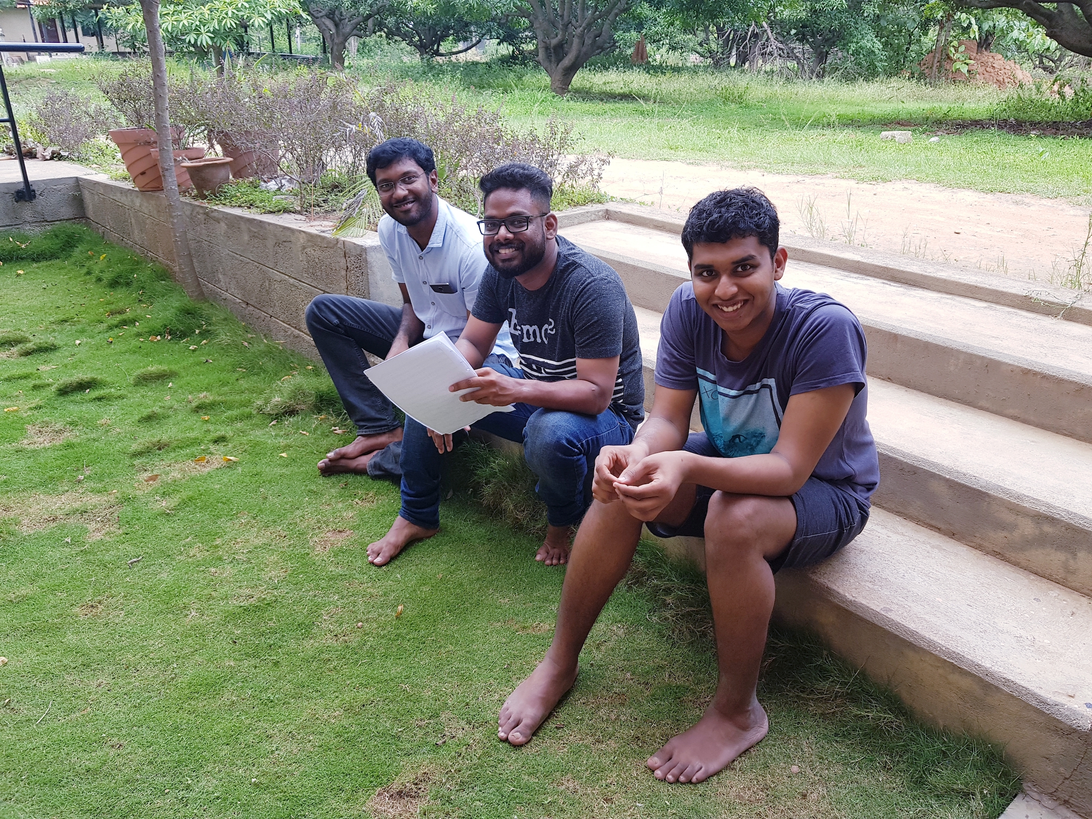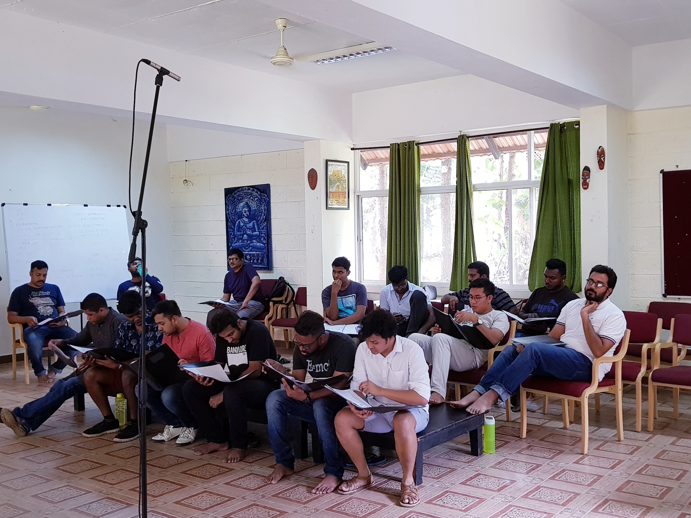 Therefore the challenge – where to find a suitable venue, in Bangalore, fulfilling the requirements on acoustics but also being in surroundings silent enough to function as a recording space? We were very happy to discover the Visthar Retreat, on the outskirts of the main city, where the only occasional disturbance were evening crickets and rain drops. Thanks to a very supportive and cooperative management of the retreat, we were able to use one of the halls, with a natural reverb, for our recording camp of three days.