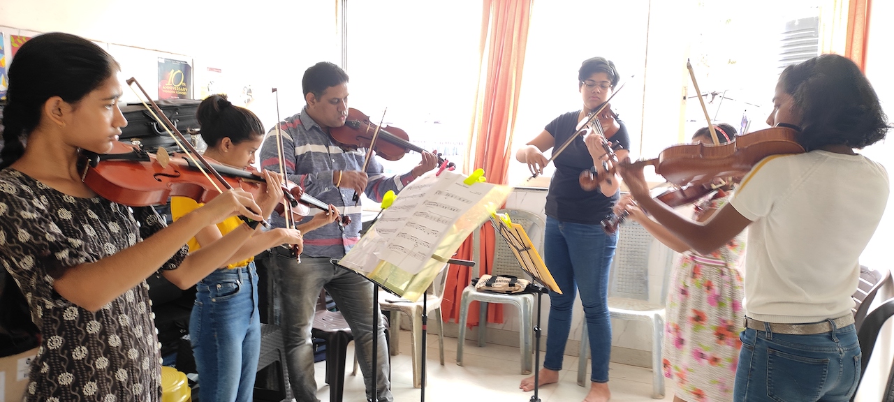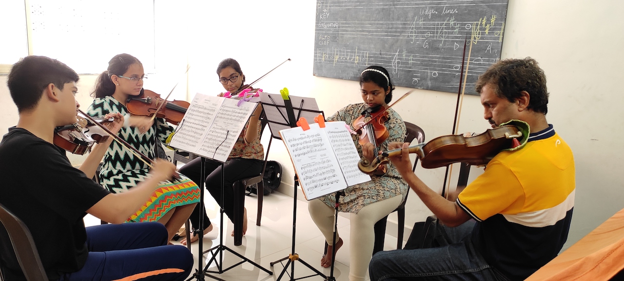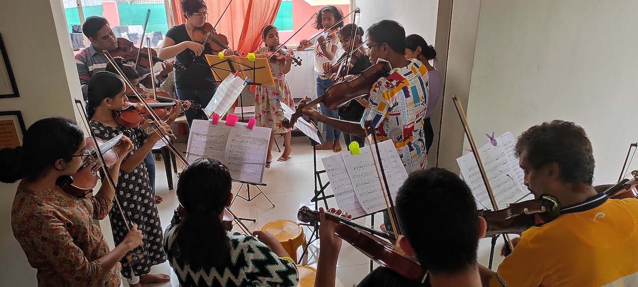 From 8-14 May, 2022, three musicians of the SOI – Averell deSouza, Prabhat Kishore (violins) and Deon D’souza (viola, violin and music appreciation) – conducted sessions and workshops for young musicians from across Goa. During the camp, the students received individual lessons and were coached in chamber music and ensemble playing.