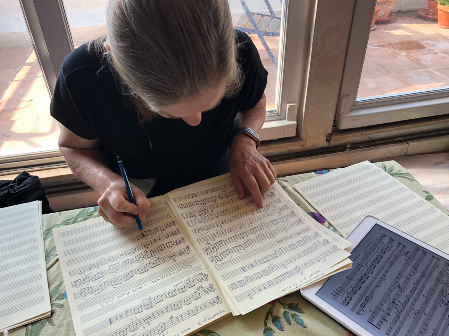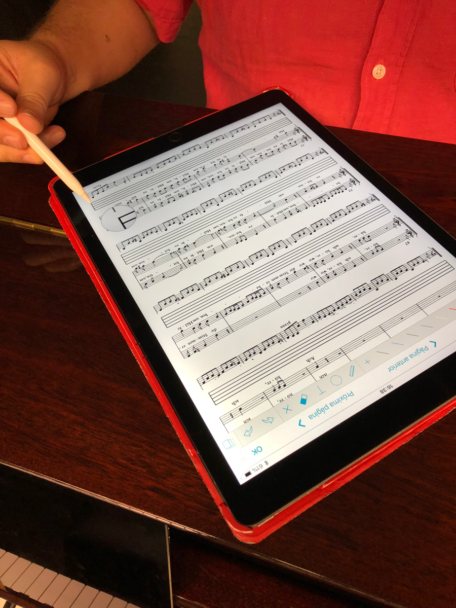 Another work on our program is a vocal duet from a Cantata by Bach. The wind players took the parts written for the two singers while I play the continuo part. In the original Bach wrote out the left hand part and the figures representing the harmonies. Modern editions usually offer either a reduction of the orchestral part for the right hand to play, or else the editor’s own version of how he interprets the harmonies indicated by the figured bass. As often happens for us we were unsatisfied with the pre-made options we found, so we decided to make our own version. Here you’ll see António adding in a blank staff on his iPad where an editor’s realization had been. Once the blank staves were added we were able to write in our own ideas. António’s immense experience as an interpreter of baroque literature was extremely valuable for this, in combination with my input about what would best fit my hand.