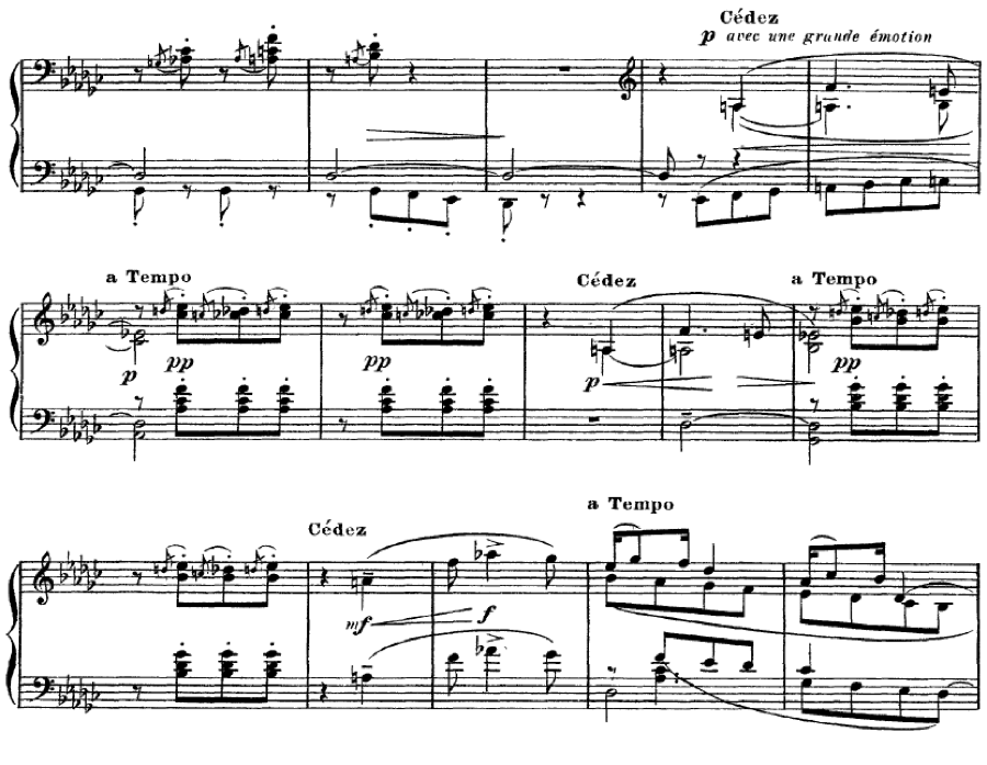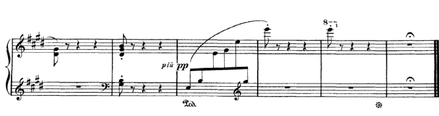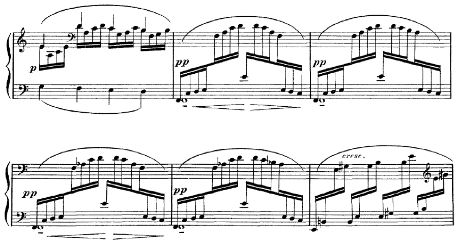 After all this attention to long notes that are sustained we might think that all long notes must be pedalled. It isn’t always the case. If they can be held with the hands then that may be the desired effect, as it creates a contrast between sustained notes and short staccatos.