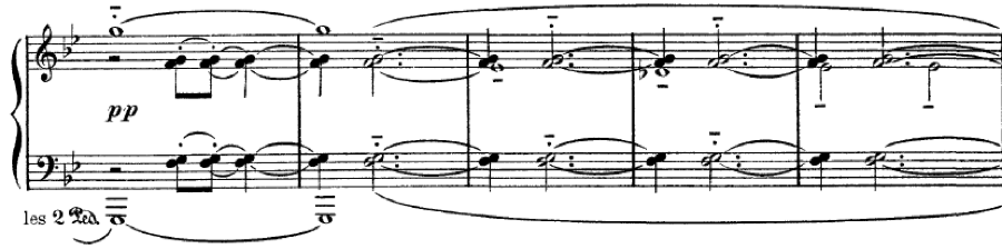 This notation is found throughout Debussy’s piano music and should be explained to students as another way the composer requested we engage the sustaining pedal.