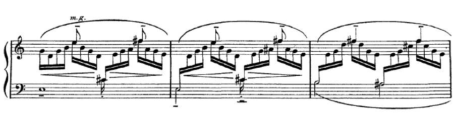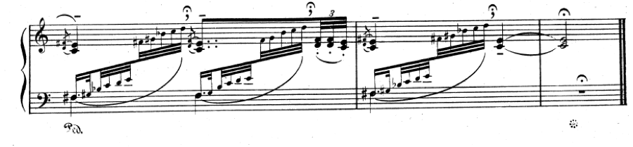 A complicated topic is whether the pedal needs to be depressed fully to achieve a desired effect. The following example has no bass note that would help our ear to organise around a harmonic center:
