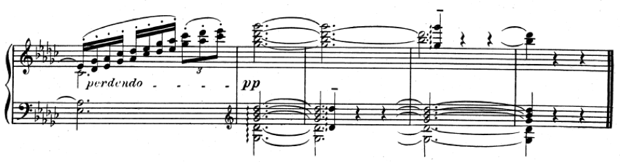 In the following example, from the popular Prelude, The Girl with the Flaxen Hair, the rolled G-flat Major chord that finishes the piece is tied through the final measures. The hands must release the chord in order to play the broken octaves that come afterward, but the pedal must remain depressed in order to sustain the chord. There was no need for Debussy to write “Ped.” as the continued sound of the chord necessitates the pedal. The fingers cannot hold the notes, so the pedal must.