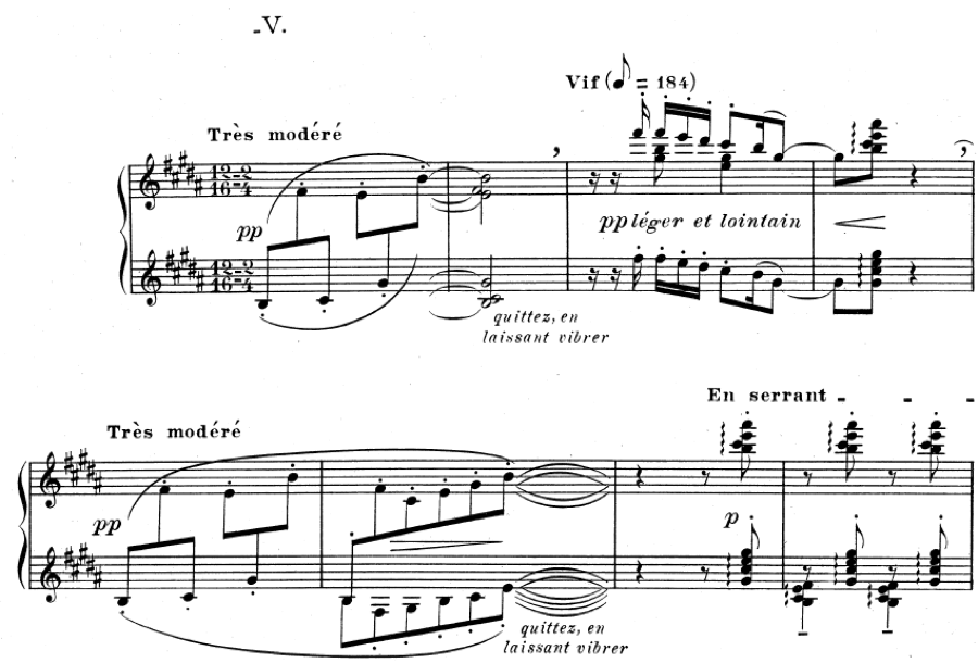 In the following example from Preludes, Book 1, we again see ties from the first measure into the second. Debussy uses words to clarify what we are to do: “quittez, en laissant vibrer,” meaning leave, or release the keys, but allow the sounds to vibrate, or resonate in the pedal. On the second line he doesn’t even feel the need to write out the notes that are being sustained in the second measure and just puts the ties. He continued to use these ties to empty space throughout his piano music and it has become a standard notational practice since then.