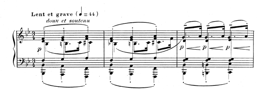 There are examples where Debussy wants a very long, sustained bass, but with so many notes above that using a single pedal would create a confused sound. In this example from The Sunken Cathedral, the E-flat in the bass is written as a whole note in the first measure. Keeping a single pedal for the entire measure would cause the many notes above to accumulate. A choice I make is to retake the pedal each time the bass note returns, honouring Debussy’s request that the E-flat be sustained, but allowing the listener to distinguish the melodies above more clearly.