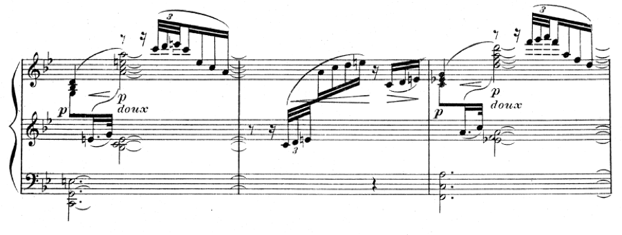 “It will be necessary to use the soft pedal during the entire length of this piece, even in places marked f.” The use of the soft pedal was not for Debussy a matter of volume as much as a way to achieve a different quality of sound. The una corda pedal on a grand piano shifts the entire action to one side. One result is that the hammers then strike two of the three strings on treble notes (though on earlier pianos they could shift far enough to strike only one string, or una corda in Italian). Another result is that the hardened felt that usually strikes the strings is shifted over so that the less-used, softer felt is then in position to strike the strings. The strings that are not being struck are vibrating sympathetically, creating a quality of sound that can’t be replicated by any amount of finger control.