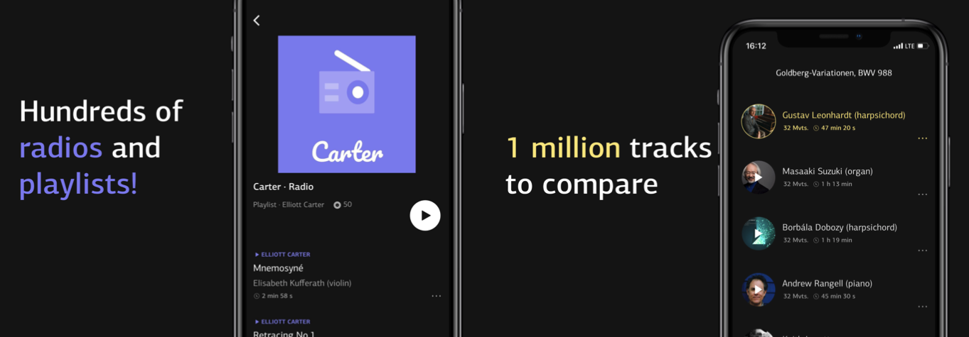 By contrast, TEMPSO has developed a data model and user interface that organizes and displays classical recordings in a clean, clear, and easily accessible way. Listeners can choose from a rich audio library that allows them to compare, for example, dozens of versions of Bach’s Goldberg Variations. Listeners can also explore performers, and access their full discographies by composers, labels and many more filters. TEMPSO’s rich data model finally allows listeners to take the backseat with automated and curated playlists that will take them on endless musical journeys.