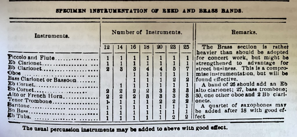 While most band leaders were limited by the instruments and the players available in the vicinity, Clappé, nevertheless, offered the following specifications for the ideal instrumentation of this type of brass and reed band: