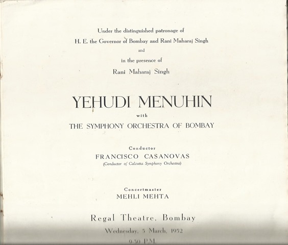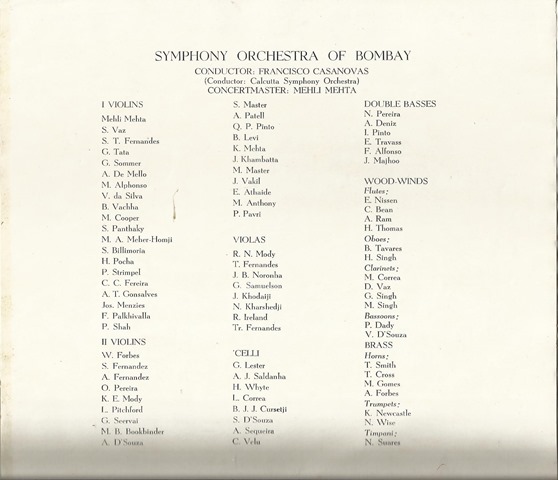 I have the roster of the musicians of the Symphony Orchestra of Bombay that played at the Regal cinema theatre on Wednesday, 3 March 1952. It was a gala concert that had the great violinist Yehudi Menuhin as guest soloist. (Incredibly, that night, he performed two (!) violin concertos, the Mendelssohn E minor and the Beethoven, separated by the mighty Chaconne from Johann Sebastian Bach’s D minor Partita for solo violin). The list of names in the orchestra reads like a Who’s Who of great instrumentalists of their age and of not just Goan but India’s music history.