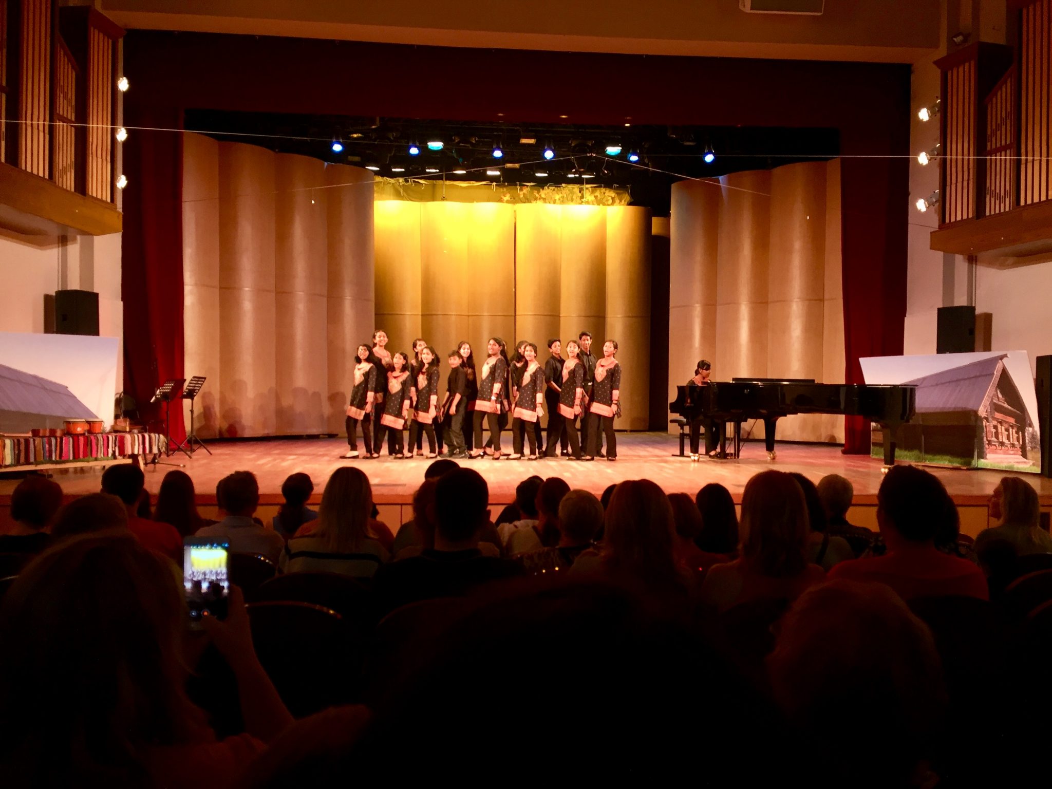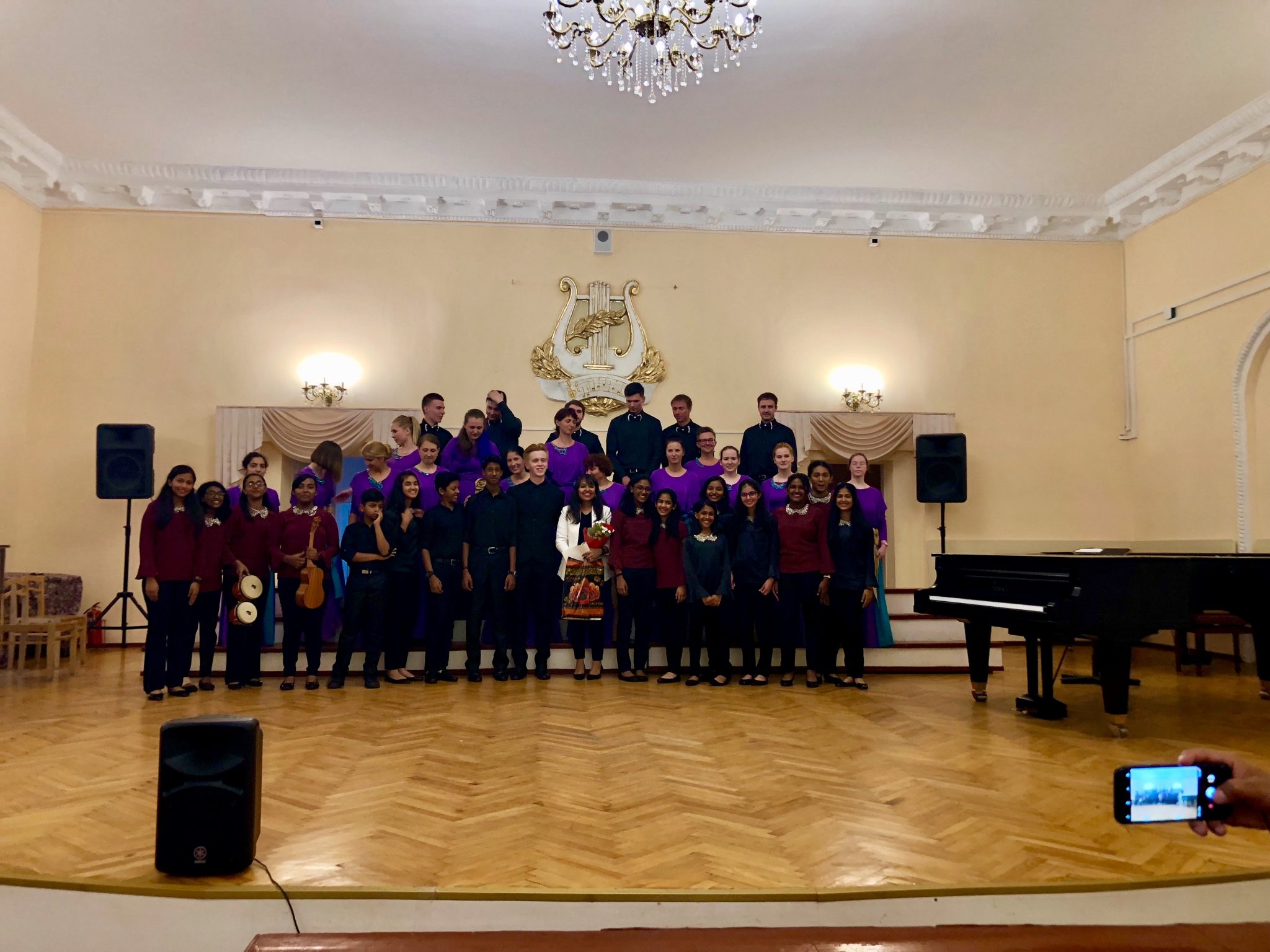 22nd May, 2018: The last performance in Russia was held at Gatchina Music School, a premier music academy serving the residents of Gatchina near Saint Petersburg. At this concert, The Harmony Chorus were the special guests and opened the evening with a mixed collection of music by English composer Rutter, Swedish composer Edenroth, American composer Trotta, and choral arrangements by Sandra Oberoi. The Gatchina children’s choirs also performed a short set of wonderful Russian folk music. Past students of The Gatchina Music School who have now formed The Youth Choir Harmony ended the evening with Russian folk songs, Gershwin’s Summertime and a few high-energy choral showcases. The evening ended with a ‘fusrhet’ – time of eating pies and celebrating through games and songs. Language did not prove to be a barrier when it came to having fun singing some Russian folk music, learning some dance and playing a few Russian games together. The children of all the choirs mingled together beautifully.