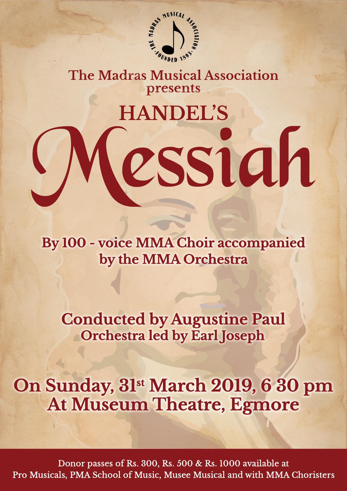 The Madras Musical Association (MMA) Choir and Orchestra will present one of the greatest and most loved oratorios of all time, George Frideric Handel’s “Messiah” on Sunday, March 31, 2019, at The Museum Theatre, Egmore. The MMA Choir will present a selection of pieces including choruses and solos in a two-hour presentation. The concert will be conducted by Augustine Paul, Music Director, The Madras Musical Association and the Orchestra will be led by Earl Joseph.