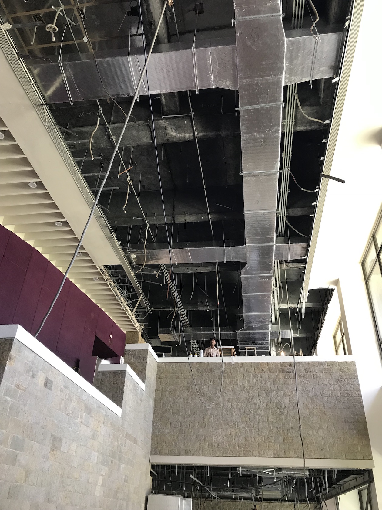 Mr. Kale took the sensible but demanding decision to add to his workload and exploit the closure period to carry out other necessary works. Around twenty different contractors are being coordinated with a precision normally only found in choreography. The JBT seats are all away being re-upholstered with their frames being refinished onsite; the onstage rigging systems are being stripped and repainted with all the critical steel wires that support the loads over the stage being replaced. Carpets are being redone, walls cleaned and ceilings replaced. Cabling for a new sound system in the JBT Foyer is being installed, though the system itself may not be installed till next season.