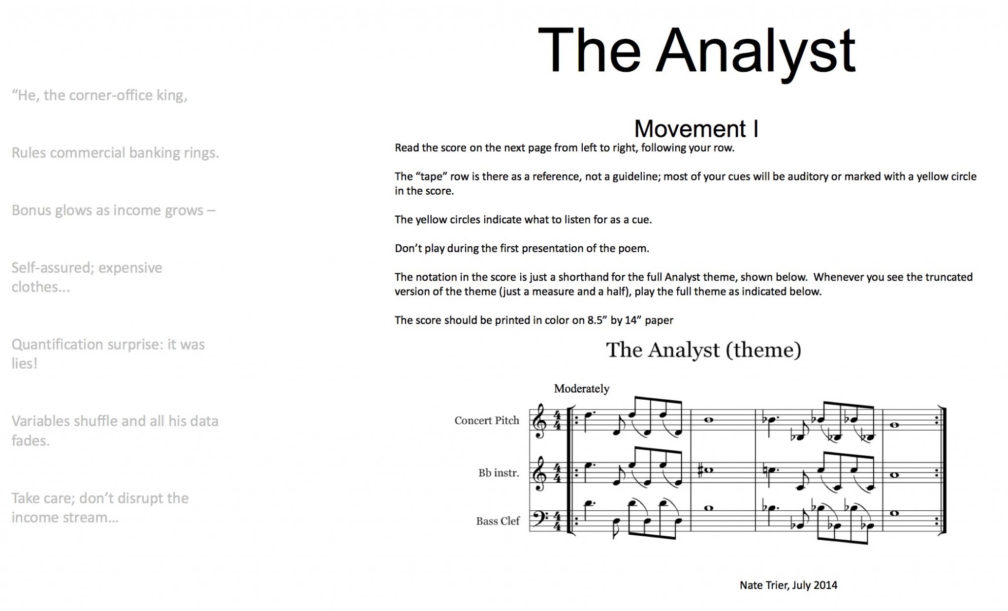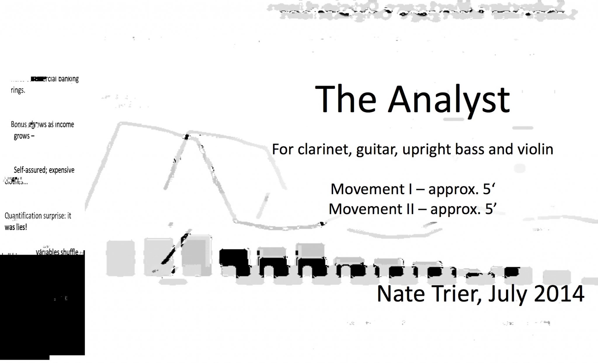 And as a musician, the right image is extremely important for my career. Being visual and actively posting good videos and pictures on social media and YouTube has become an essential form of my musical existence. Even our words are catered to the visual. We do not use famous as much as ‘getting noticed’. Being a part of the ‘visual epidemic’ definitely has its perks. In our quest for the visual, new composers have become more detailed and accurate on what they exactly want from their performers. Take, for example, Nate Trier’s “The Analyst” written in July 2014, whose music score looks something like this: